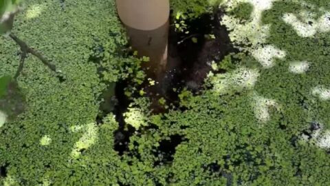 Đội mũ tai bèo đứng giữa hồ